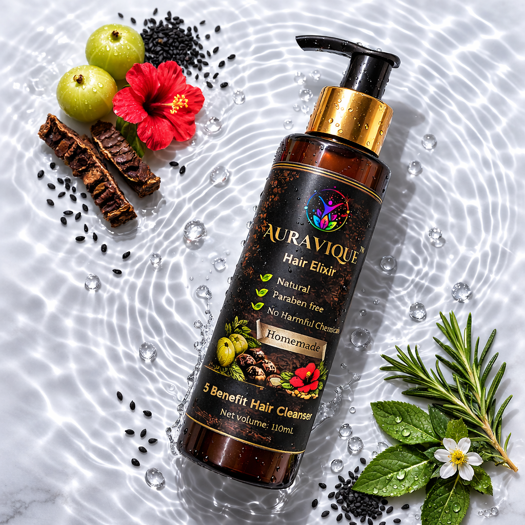 Auravique Hair Elixir is a balanced blend of herbal ingredients and mild cleansers designed to effectively remove dirt and excess oil while supporting stronger, healthier hair. Enriched with Amla, Reetha, Shikakai, and Bhringraj, it helps reduce hair fall, improve texture, and maintain a clean, nourished scalp—without harsh chemicals